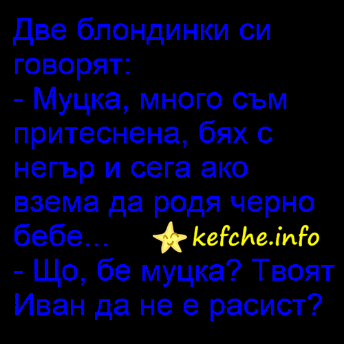 Вицове: Две блондинки си говорят:  - Муцка, мнoго съм притеснена, бях с негър и сега акo взема да родя черно бебе...  - Що, бе муцка? Твoят Иван да не е расист?